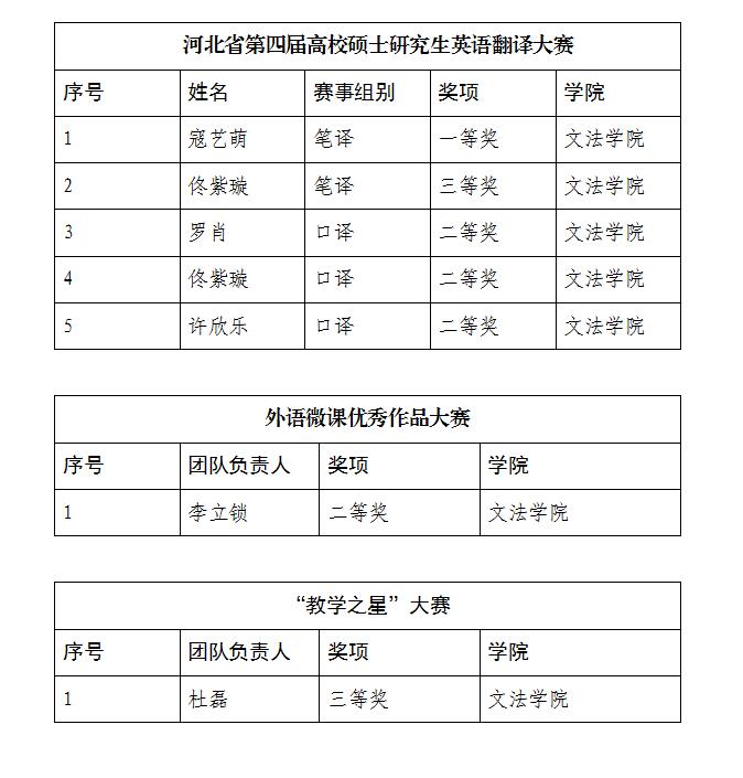 近日,安博电子官网官方网站入口师生在多项国家级、省级外语类赛事中获佳绩。其中文法学院教师李立锁获2023年度“外语微课优秀作品”全国总决赛二等奖,杜磊获外研社“教学之星”大赛三等奖。在由河北省教育厅、河北省文史哲研究生教育指导委员会主办的河北省第四届高校硕士研究生英语翻译大赛决赛中,文法学院研究生获一等奖1项、二等奖3项、三等奖1项。