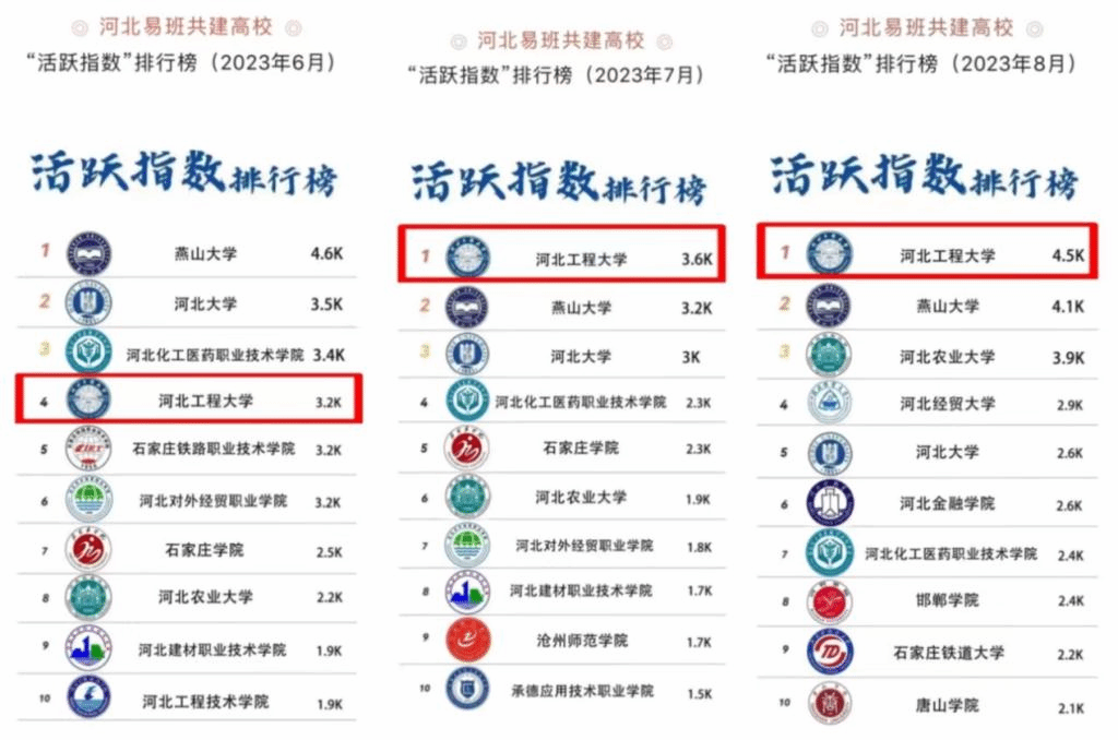 近日,教育部易班发展中心公布全国易班共建高校共建指数排名,安博电子官网官方网站入口连续六个月在河北易班共建高校“活跃指数”排名TOP10榜单、“共建指数”排名TOP10榜单上位居前列。其中,7月、8月两次位列河北易班共建高校“活跃指数”排行榜第一。