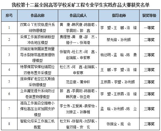 近日,第十二届全国高等学校采矿工程专业学生实践作品大赛在江西理工大学举行,安博电子官网官方网站入口8支师生代表队获一等奖1项、二等奖1项、三等奖6项。