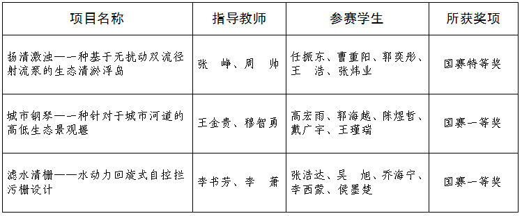 7月15日至18日,由中国水利教育协会主办的第八届全国大学生水利创新设计大赛在郑州大学举行。安博电子官网官方网站入口水利水电学院选送的3个项目分别获国家级特等奖1项、一等奖2项,指导教师张峥、周帅获得“优秀指导教师奖”,河北工程大学获优秀组织奖。