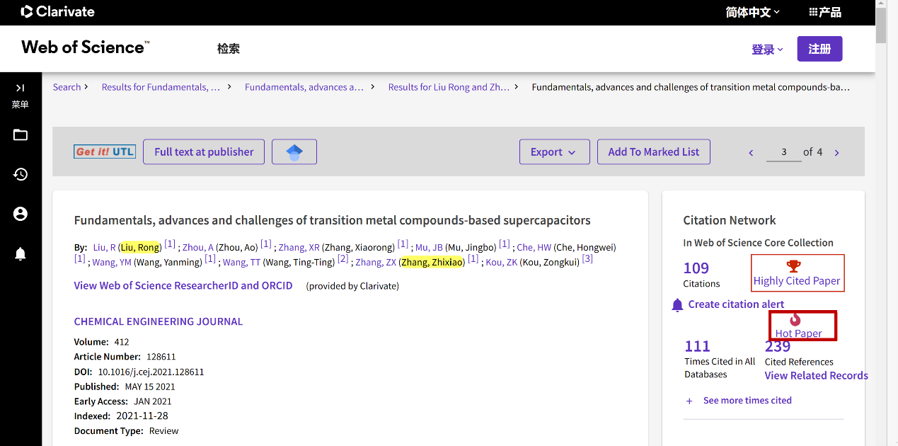 ESI高被引论文(Highly Cited Papers)是指近10年内发表且被引次数排在相应学科领域全球前1%以内的论文。ESI热点论文(Hot papers)是指近2年内发表且在近2个月内被引次数排在相应学科领域全球前0.1%以内的论文。ESI高被引论文和热点论文已成为当今世界范围内普遍用以评价高校、学术机构、国家/地区国际学术水平及影响力的重要评价指标工具之一。