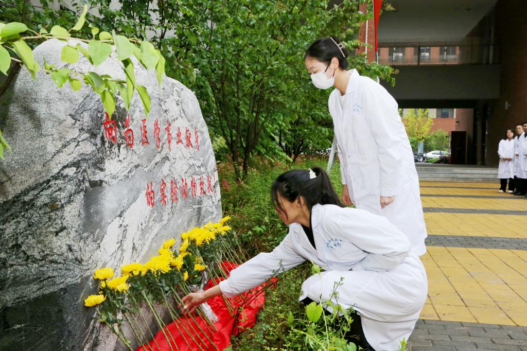 仪式上,老师和同学们身穿白大褂,手持鲜花向“动物英雄”献花,纪念为人类健康和医学事业发展献出宝贵生命的实验动物。