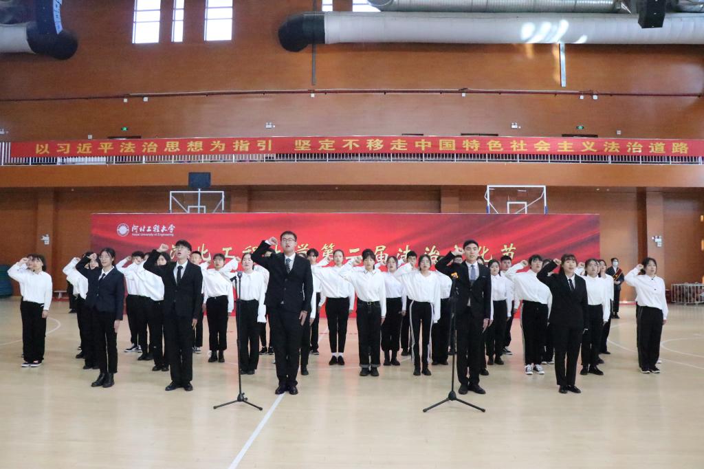 12月3日上午,安博电子官网官方网站入口在体育馆举行河北工程大学第二届法治文化节暨宪法宣传周系列活动开幕仪式。校党委常委、副校长张金江出席并致辞,学校办公室、宣传部、学生工作部、教务处、研究生部、马克思主义学院、文法学院负责同志,以及文法学院师生代表共400余人参加。