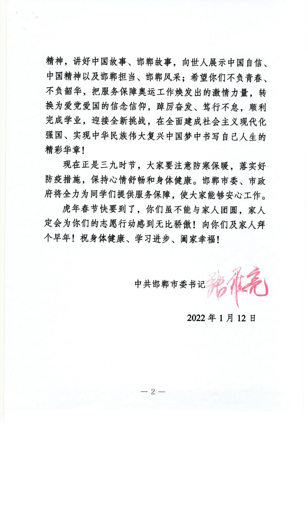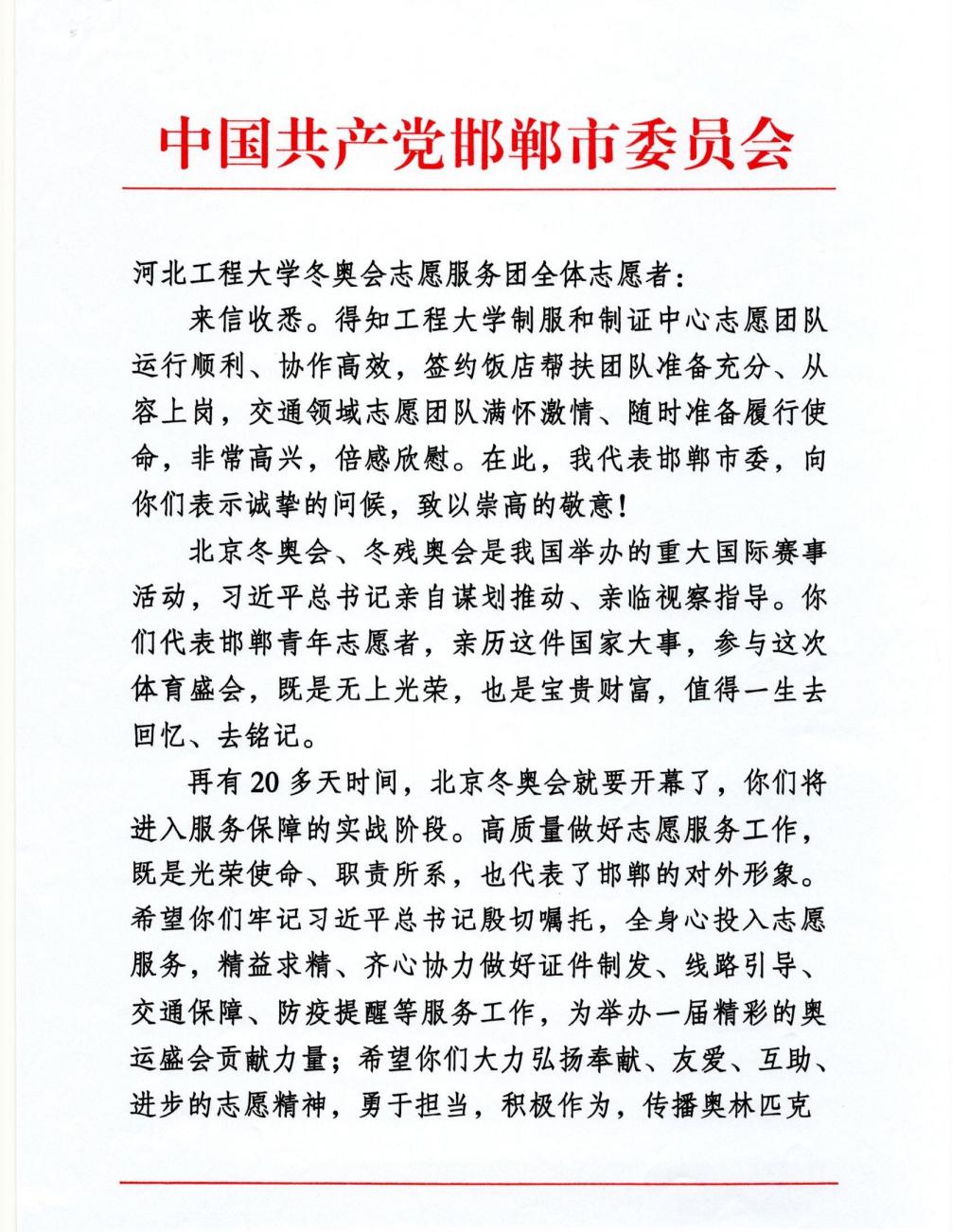 近日,中共邯郸市委书记张维亮向安博电子官网官方网站入口冬奥会志愿服务团全体志愿者回信,代表邯郸市委,向志愿服务团全体志愿者表示诚挚的问候,并提出希望和要求。