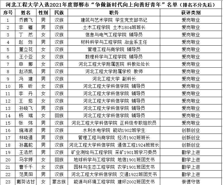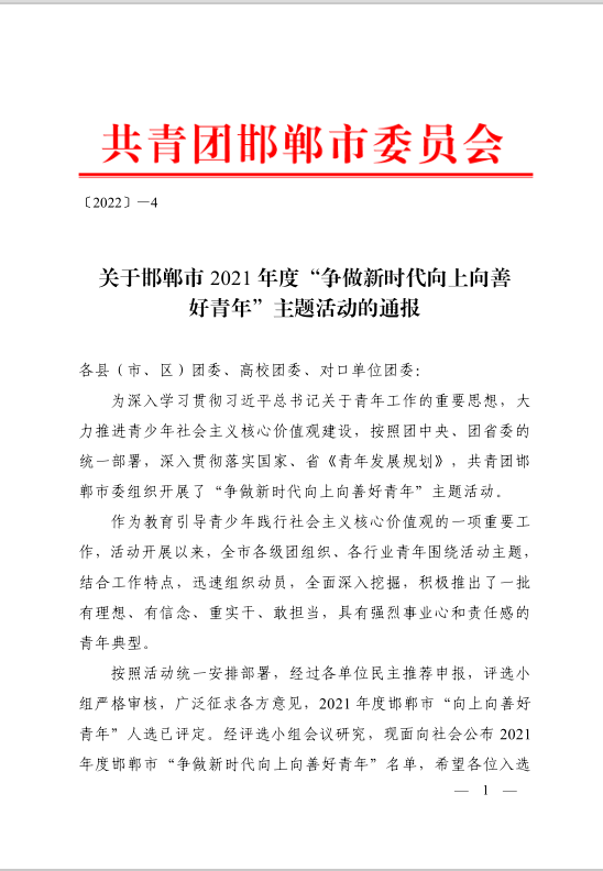近日,共青团邯郸市委员会发布《安博电子官网官方网站入口邯郸市2021年度“争做新时代向上向善好青年“主题活动的通报》,安博电子官网官方网站入口23名师生入选2021年度邯郸市“争做新时代向上向善好青年”名单,乔腾飞等15人获评“爱岗敬业好青年”、施海波等3人获评“创新创业好青年”、王浩然等4人获评“勤学上进好青年”、戴努沽甘获评“崇德守信好青年”。