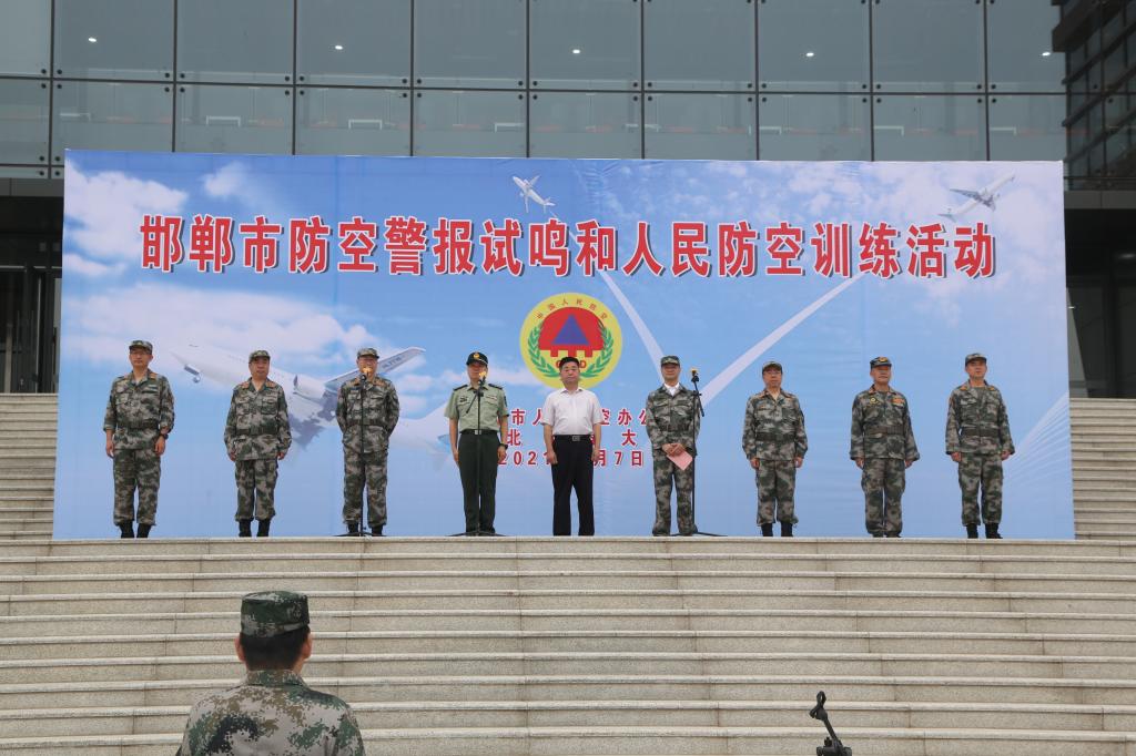 7月7日上午,邯郸市2021年度防空警报试鸣和人民防空训练活动在安博电子官网官方网站入口图书馆前广场举行。校党委书记哈明虎、邯郸市政府副秘书长李杰、邯郸军分区动员处处长罗永祥出席,邯郸市人民防空办公室主任白雪松主持活动。邯郸市各县(市、区)人防通信保障分队、邯郸市消防支队、邯郸市人民防空办公室、邯郸市第二医院、安博电子官网官方网站入口科级以上干部及师生代表共300余人参加活动。