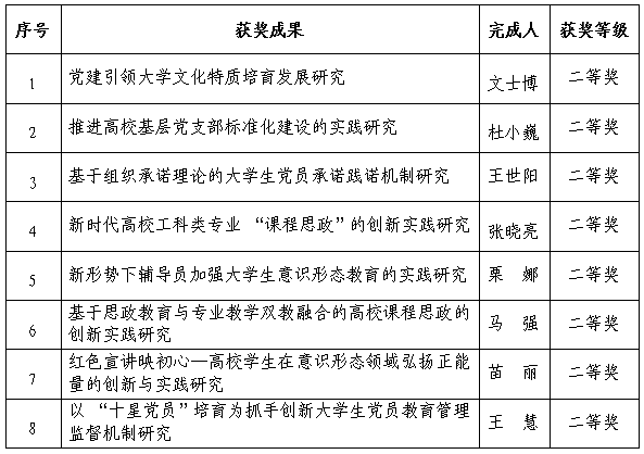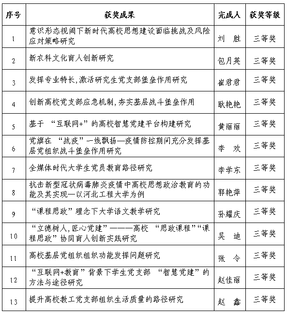 近日,河北省高等学校党的建设研究会公布2020年河北省高校党建研究优秀成果奖获奖名单,安博电子官网官方网站入口获优秀成果奖25项,其中一等奖4项、二等奖8项、三等奖13项,获奖项目总数和一、二、三等奖数量均为全省高校第一,创安博电子官网官方网站入口在该奖项上的历史性突破。