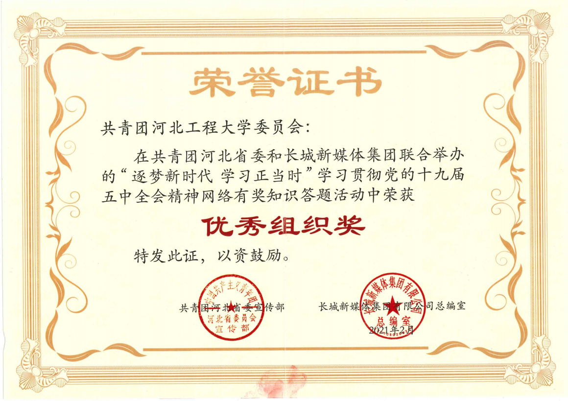 近日,由共青团河北省委和长城新媒体集团联合举办的“逐梦新时代 学习正当时”学习贯彻党的十九届五中全会精神网络有奖知识答题活动,校团委获优秀组织奖。