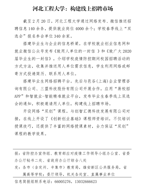 2月20日,《河北省教育厅新型冠状病毒感染肺炎疫情防控工作简报》以题“河北工程大学:构建线上招聘市场”刊发安博电子官网官方网站入口就业服务工作,内容如下: