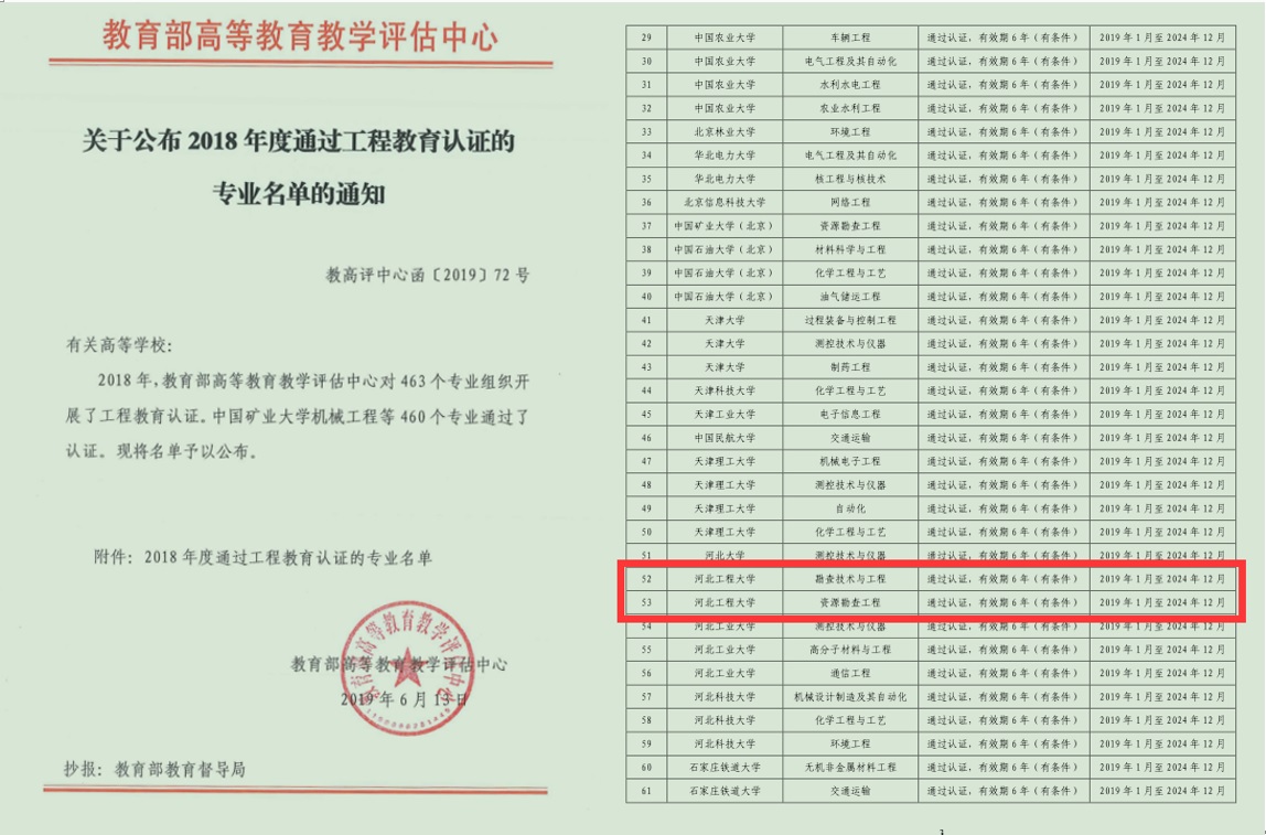 近日,教育部高等教育教学评估中心公布了2018年度国际工程教育专业认证结论,安博电子官网官方网站入口资源勘查工程专业、勘查技术与工程专业通过认证,认证时效为6年,自2019年1月至2024年12月。这是安博电子官网官方网站入口首次通过《华盛顿协议》下的国际工程教育专业认证,标志着上述两个专业迈入了全球工程教育“第一方阵”,专业人才培养质量已达到国际等效的工程教育标准及要求,是安博电子官网官方网站入口教育教学改革取得的新突破,为安博电子官网官方网站入口工程教育的国际化打开了新局面。