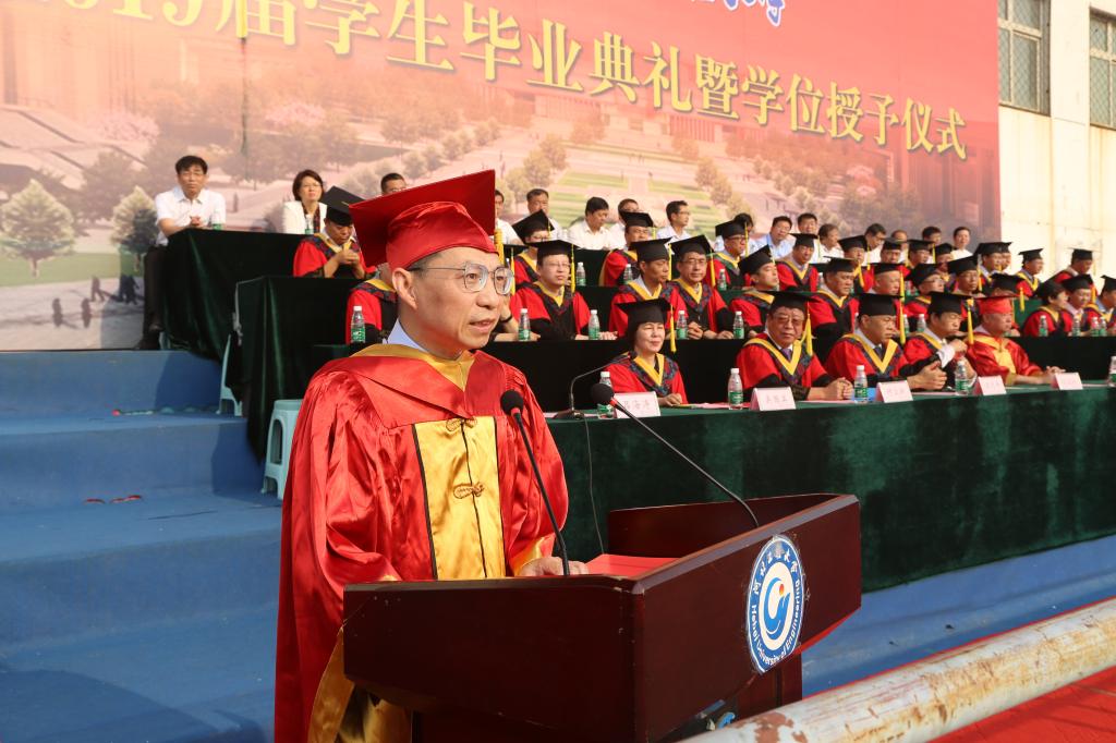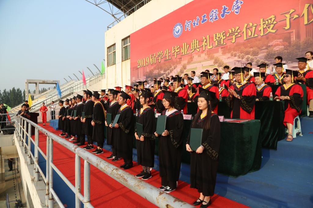 6月18日上午,安博电子官网官方网站入口2019届学生毕业典礼暨学位授予仪式在东校区运动场举行, 590名博士、硕士研究生,6343名本科生顺利完成学业。校领导哈明虎、练继建、王虎平、吕海涛、刘志军、何立新、贾东水、吴国英、张金江、刘心,河北省高端人才孙玉壮、刘建功出席典礼并为毕业生代表颁发毕业证书、学位证书。典礼由校党委常委、副校长吕海涛主持,校党委常委、副校长何立新宣读毕业研究生及授予博士、硕士学位学生名单,副校长吴国英宣读本科毕业生及授予学士学位学生名单。校学位评定委员会委员,机关各部门、各教学单位、各教辅单位的主要负责人出席典礼仪式。