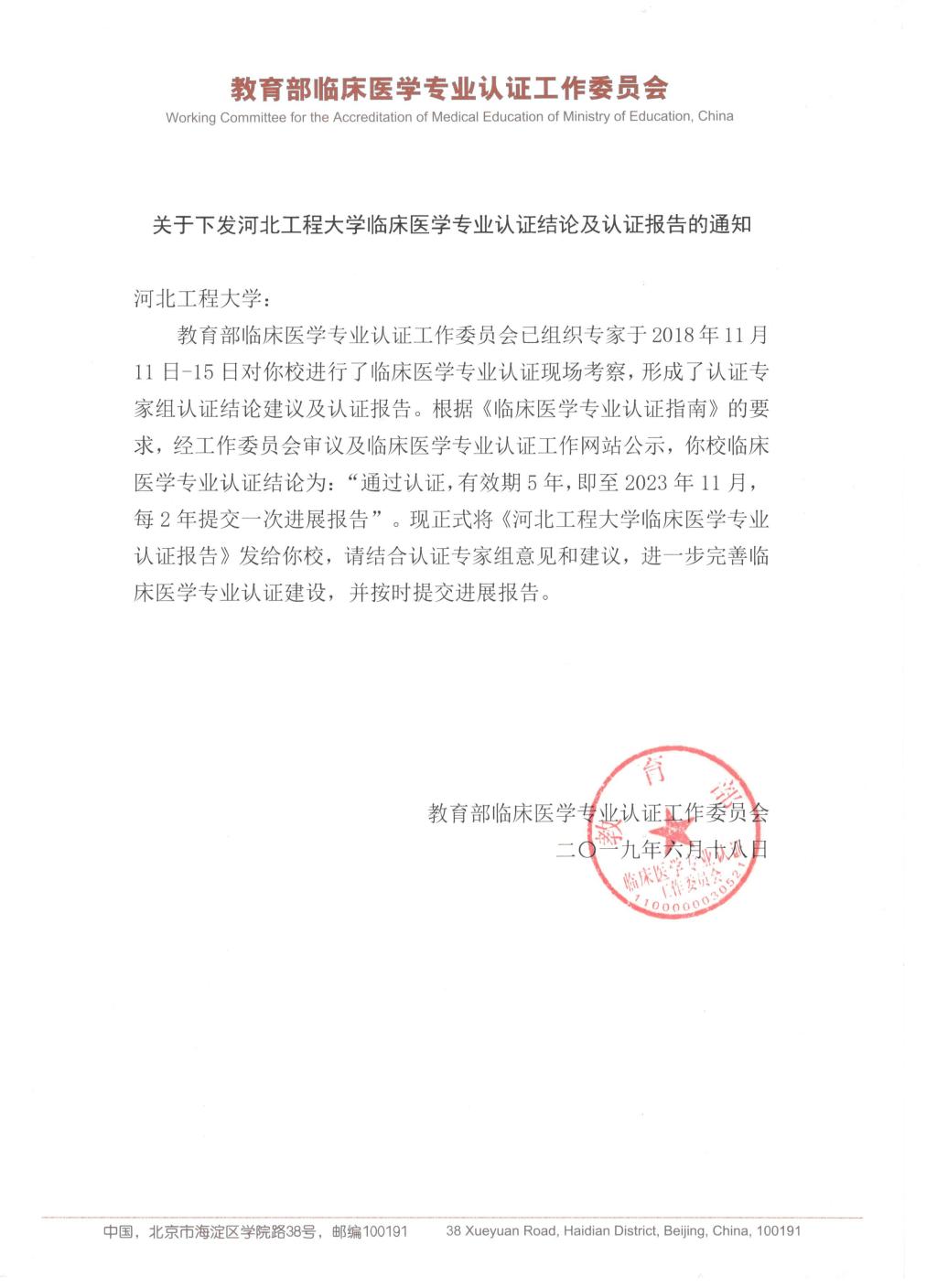 近日,教育部临床医学专业认证工作委员会公布了2018年认证院校的认证结论。经认证工作委员会审议和网上公示,安博电子官网官方网站入口临床医学通过专业认证,有效期5年,自2018年11月至2023年11月。临床医学专业认证是一种外部质量保证制度,其价值取向在于保证学校办学质量的提高和可持续发展。