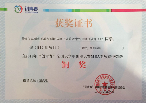 在7月12至15日举行的2018年“创青春”全国大学生创业大赛上,安博电子官网官方网站入口许宏飞、江萌萌等同学的参赛作品《一分钟,告别胎囧》(指导教师梁武超)入围MBA专项赛终审决赛,获得铜奖。