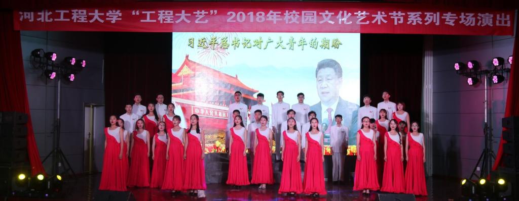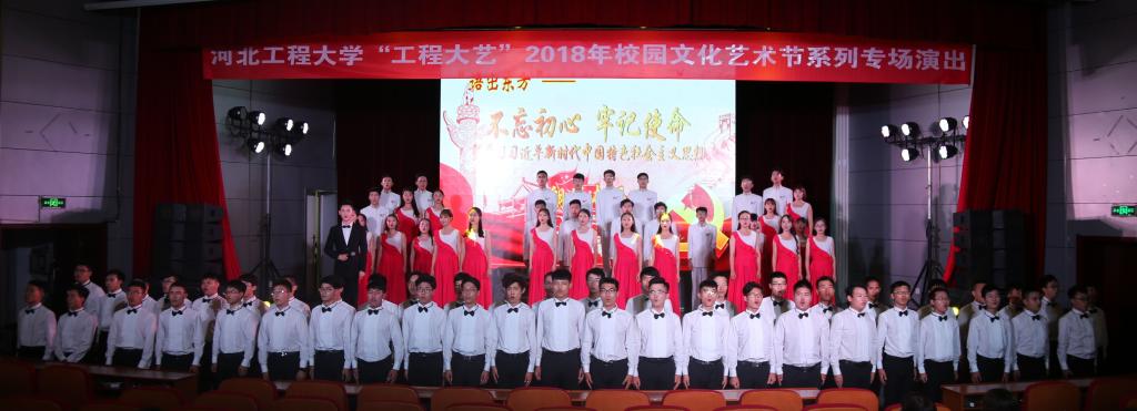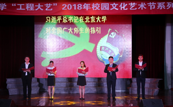 演出在齐声高唱国歌声中拉开帷幕,分为十九大号角、总书记谆谆教诲、走进新时代等篇章。师生代表满怀激情表演、声情并茂朗诵,展现了当代大学生充满道路自信、理论自信、制度自信和文化自信,对党和祖国的无比信赖和热爱,对未来充满无限向往和期待,在全体演员与现场观众齐声欢唱《歌唱祖国》中将晚会推向高潮。全场演出气氛浓厚,掌声阵阵,充满正能量。