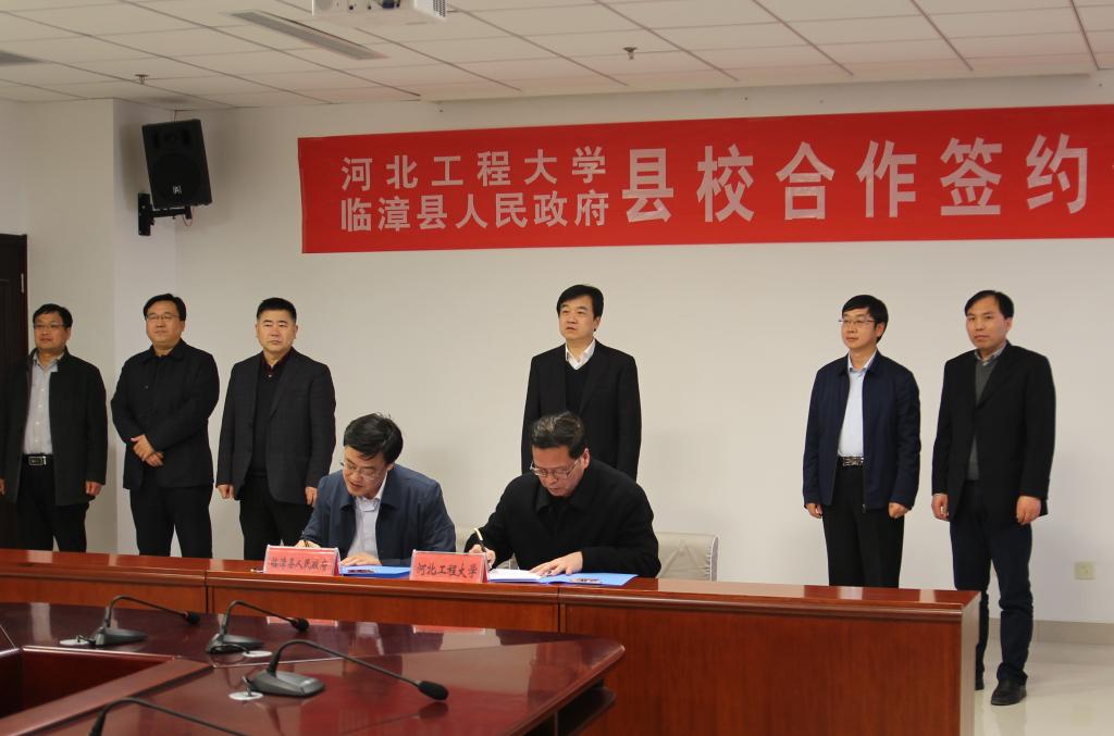 图为校长王延吉、临漳县人民政府县长于保叙代表双方签订校县合作框架协议