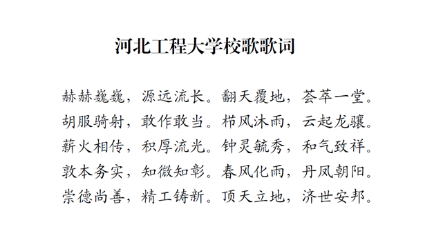 河北工程大学新校训、校徽、校歌歌词由学校大工程文化研究院主创,成员包括:哈明虎、刘胜、李怀、王彦林、侯居茌、万永彪、薛晴、孙国栋、王超。刘超、郭星、王世阳、杜瑞雪参加校徽设计。贾东水、刘心参加校歌歌词创作。校歌由张淑兰谱曲、蔺爱刚编曲。4100余名师生员工、校友参与过程稿讨论。 |